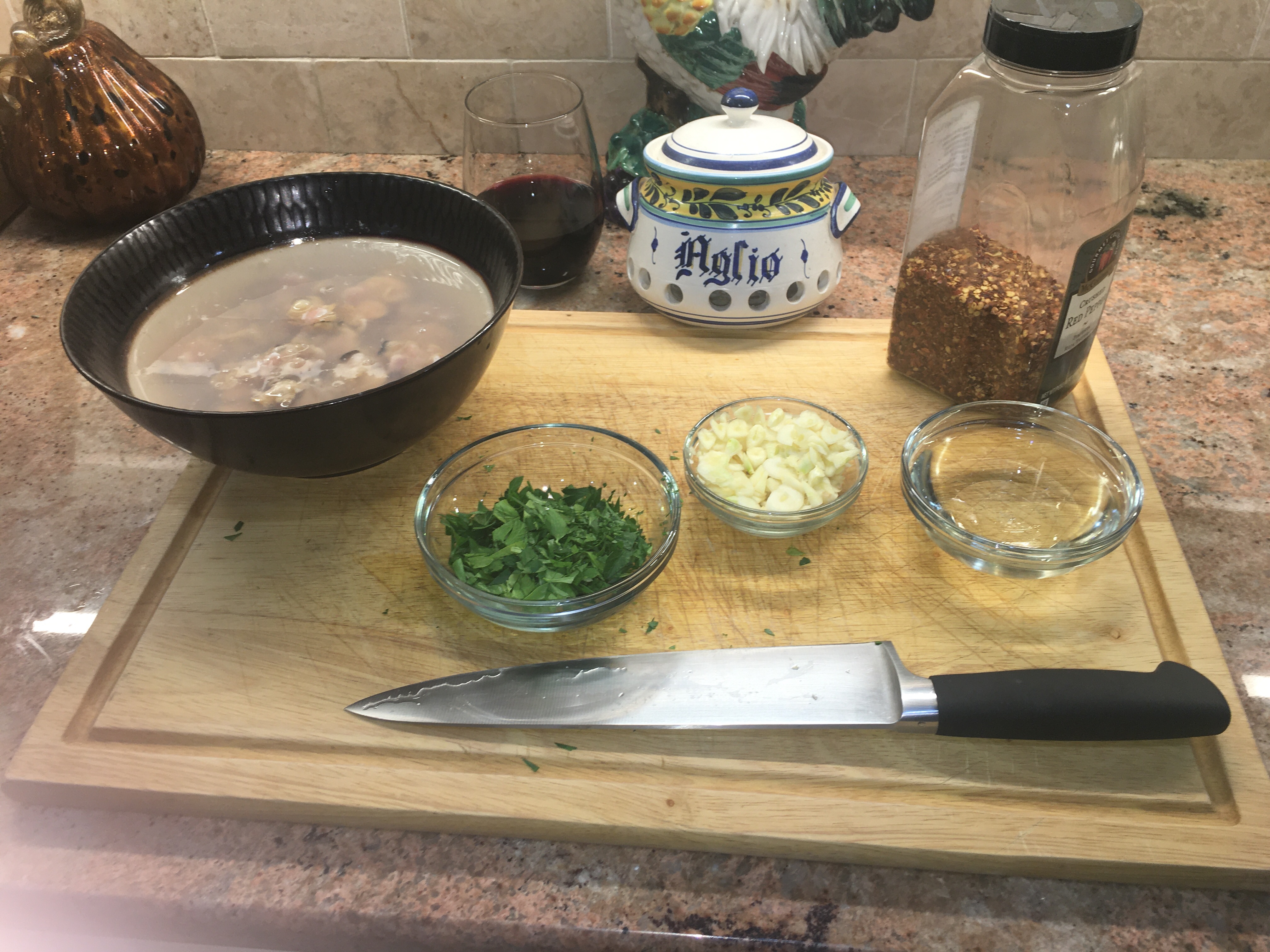 1 bag of fresh clams, 36 or 50 count. Garlic, 10 cloves to a full head, depending on your own personal taste. White wine – approximately 1 cup. Parsley. Olive oil. Red pepper flakes, to taste.