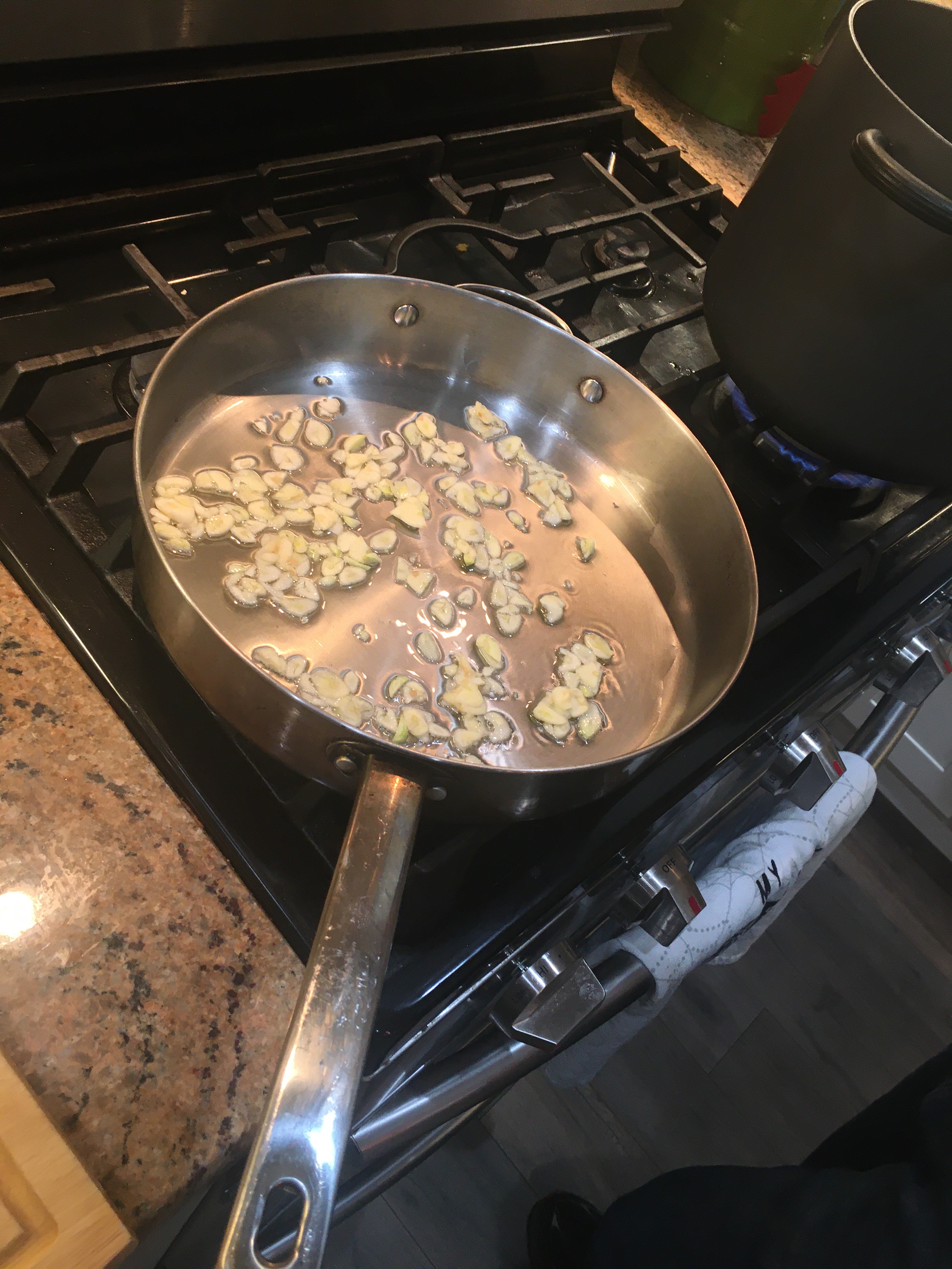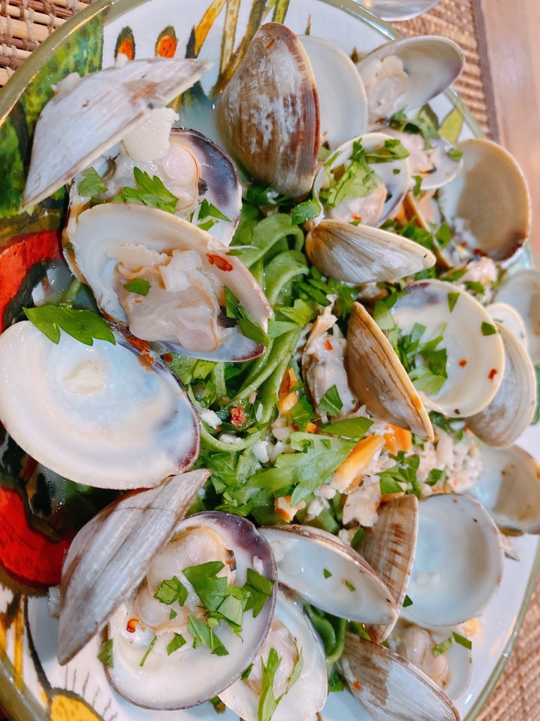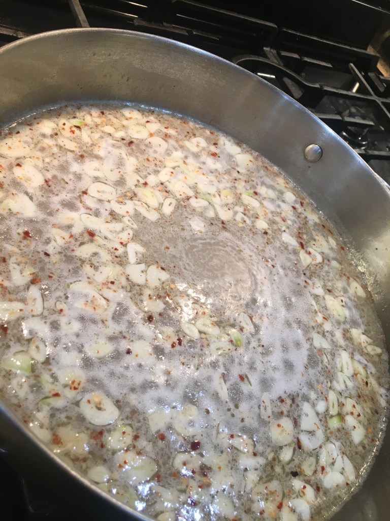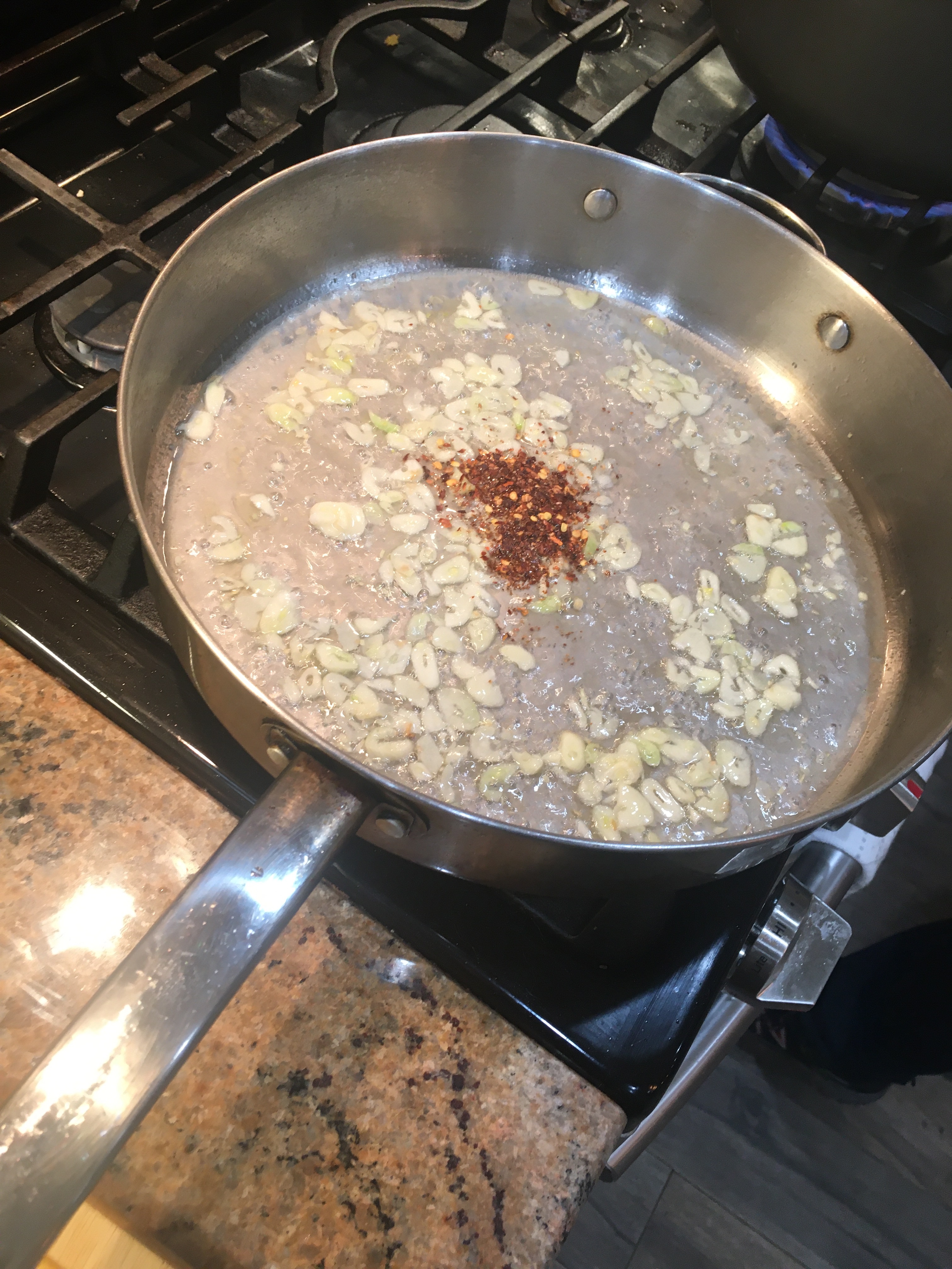 Start with an adult beverage 🍷!!! Soak clams in salted ice water with a few tablespoons of corn meal to help purge sand and to rehydrate clams. This is going to make a natural clam broth which is where all of your flavors come from. Get rid of any open clams. Coat the bottom of a pan with olive oil. Lightly saute garlic and avoid burning. Add in the red pepper flakes, reduce heat and add white wine. Rinse clams and add them into the pan and bring to a boil in a covered pan. Clams are cooked as soon as they open. DO NOT over cook! Add parsley.