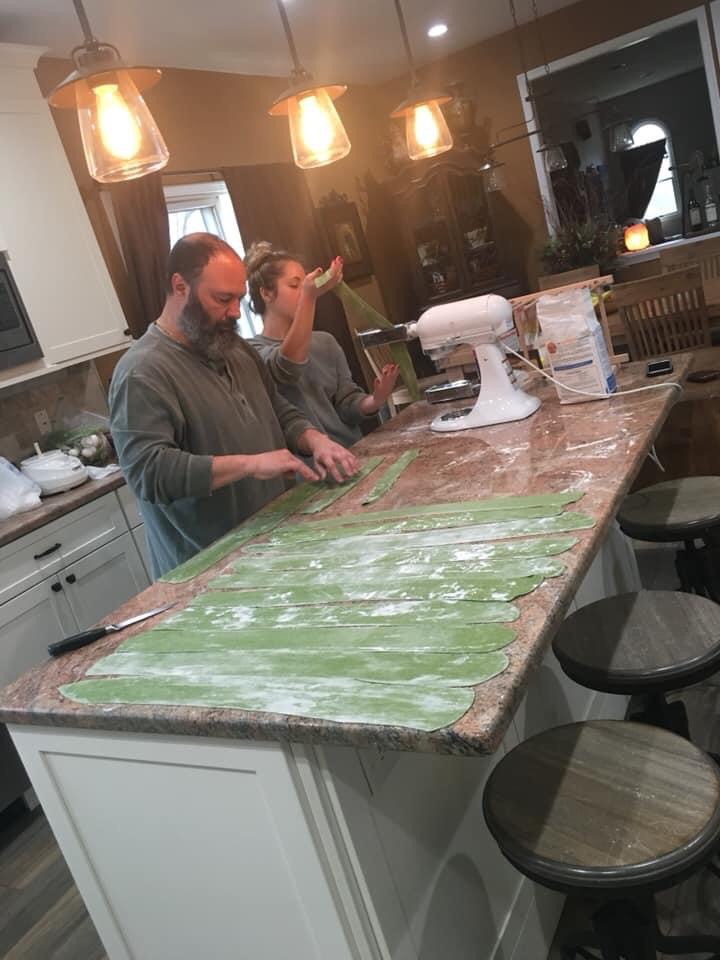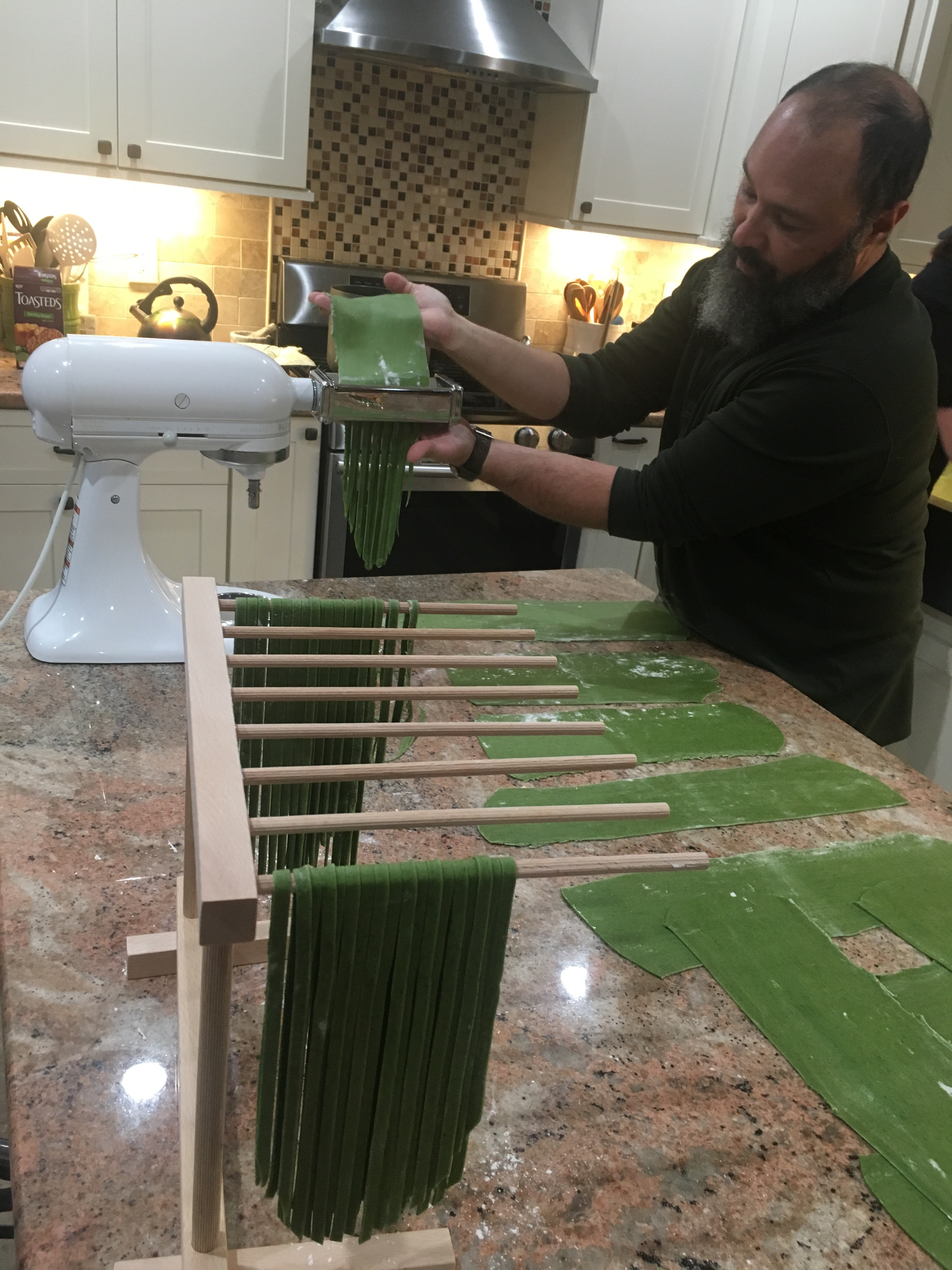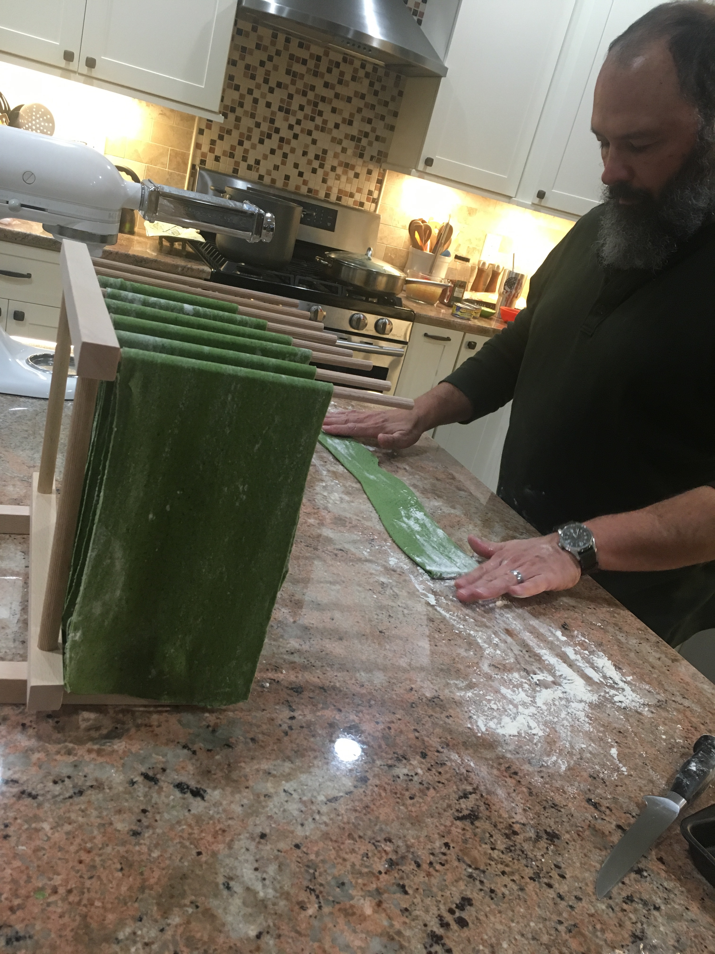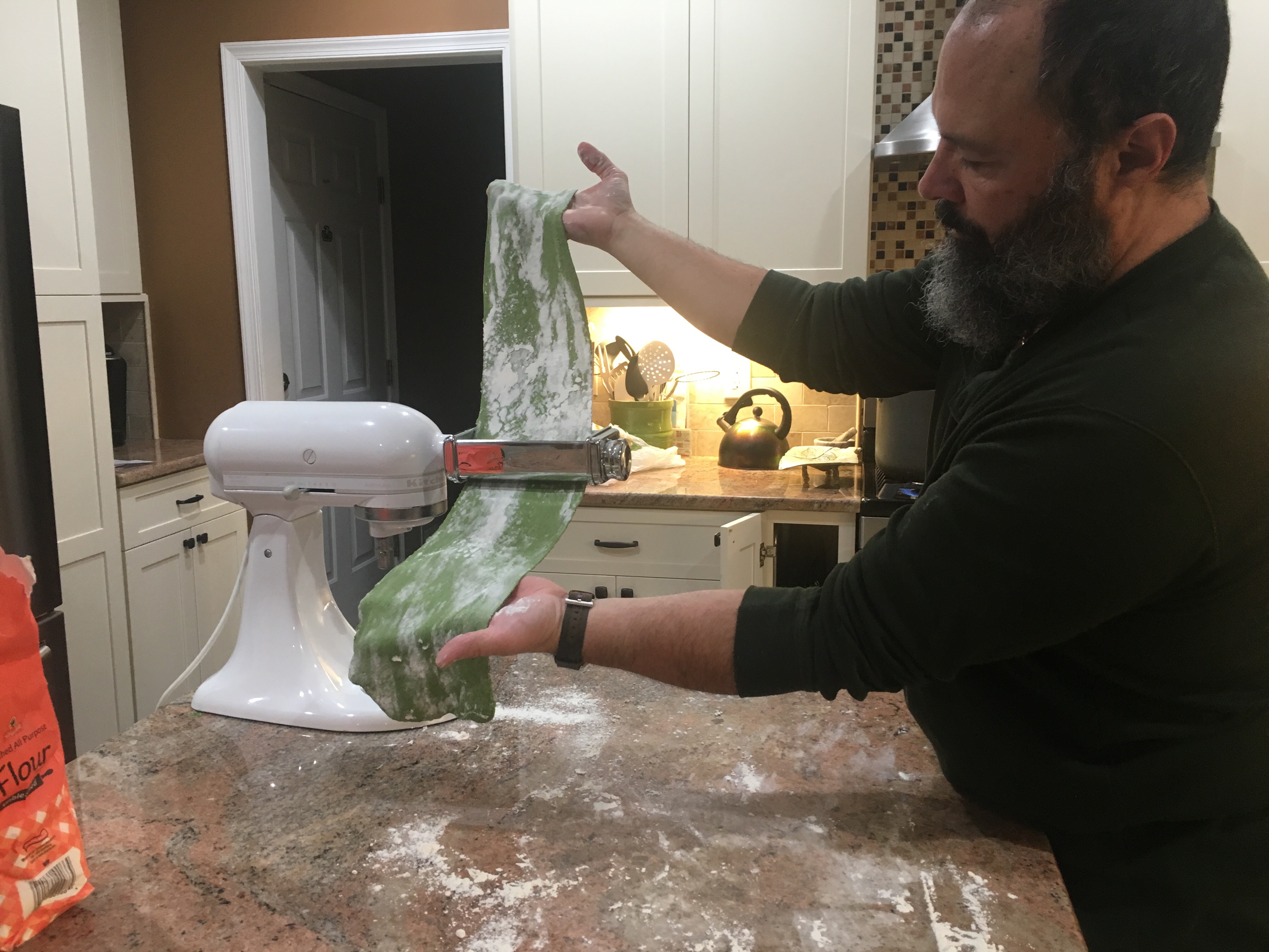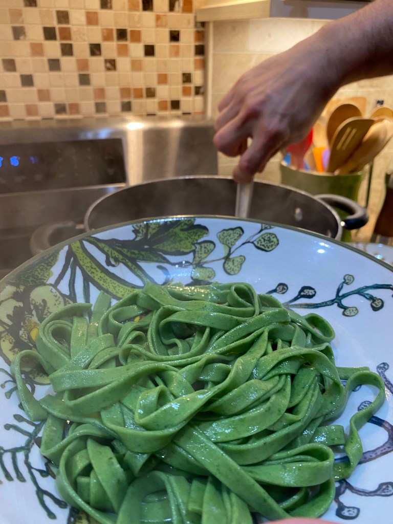 Start with approximately 1 pound of fresh baby spinach. Coat the bottom of a large pan with olive oil and saute until wilted (the softer the better). Remove from heat and place spinach in a food processor and blend until as smooth as possible. It’s ok to add water if needed. For approximately 6 servings of pasta, start with 4 cups of flour. Either in a bowl or on a solid surface counter (if working on a flat counter you are going to make a well in the middle of the flour to add your liquid ingredients). Whisk 1 egg and add into the pureed spinach mixture. Incorporate wet ingredients into the flour and then add cold water in small incriments to achieve a dry kneadable ball of dough. If dough is to dry add water, if dough is to wet add flour. Brainless!