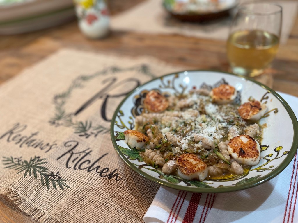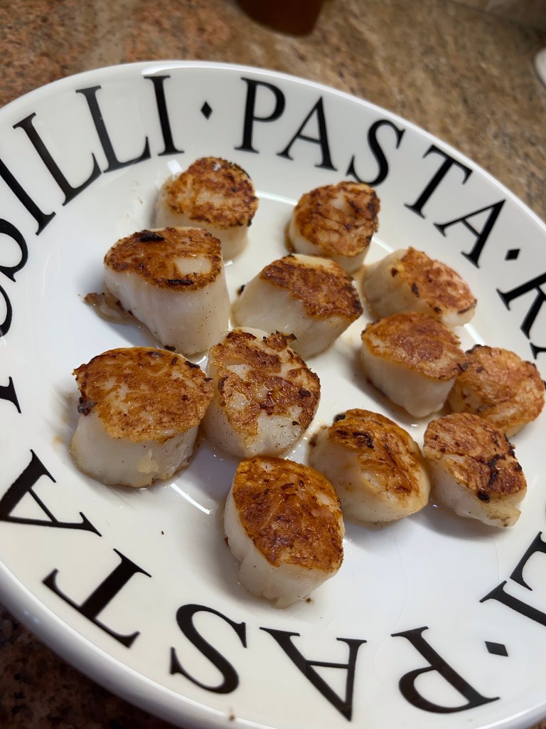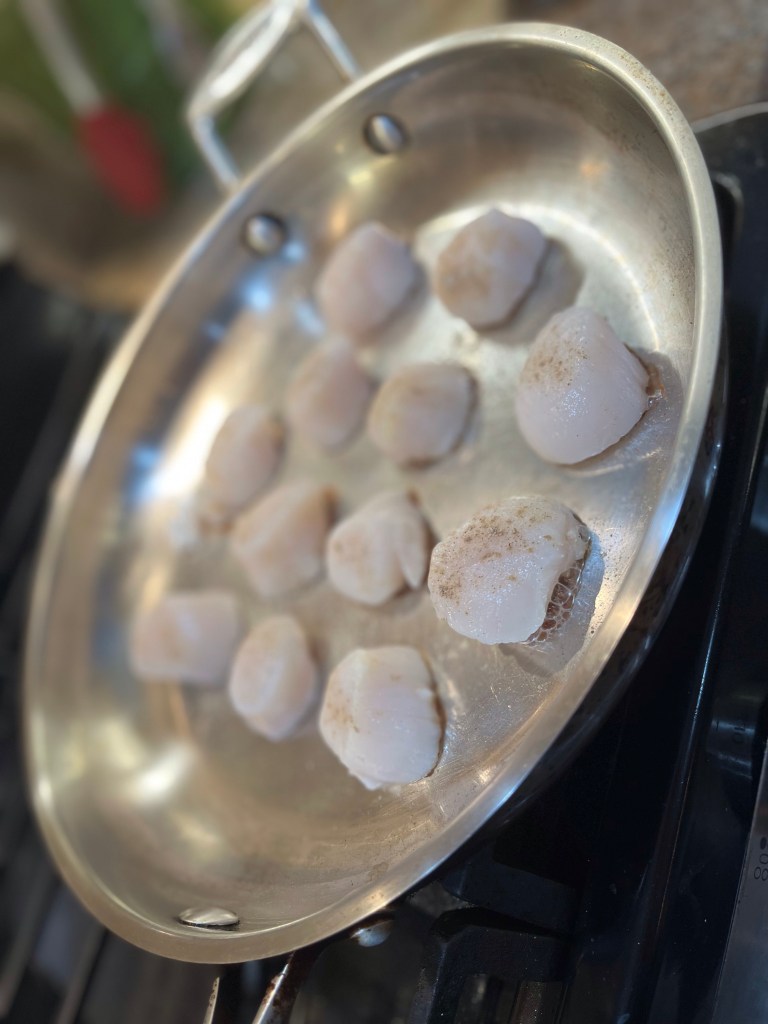While the pasta is cooking, season and sear your scallops: